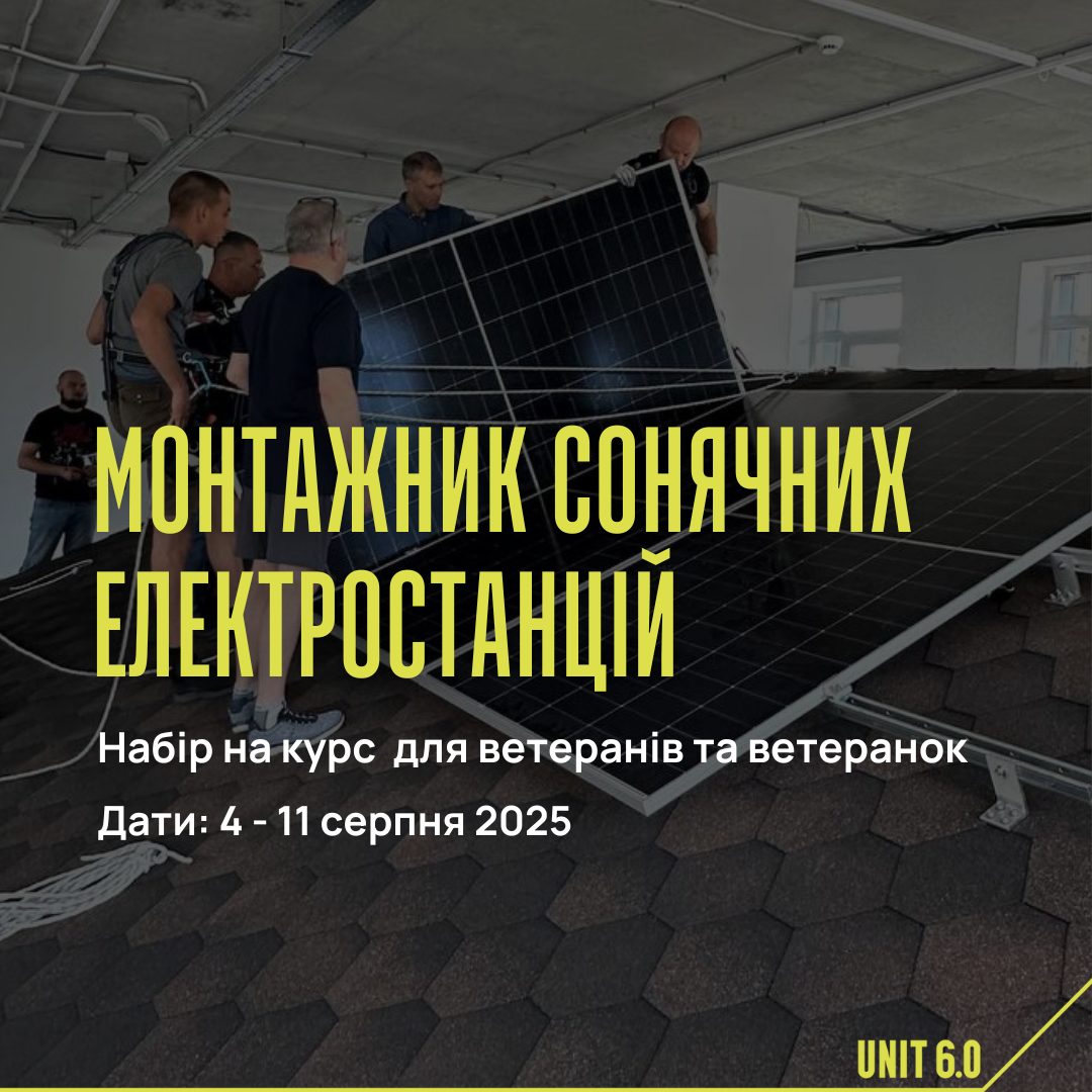 Unit 6.0 в рамках проєкту Reskilling Ukraine оголошує набір серед ветеранів на безоплатний курс “Монтажник сонячних електростанцій”.