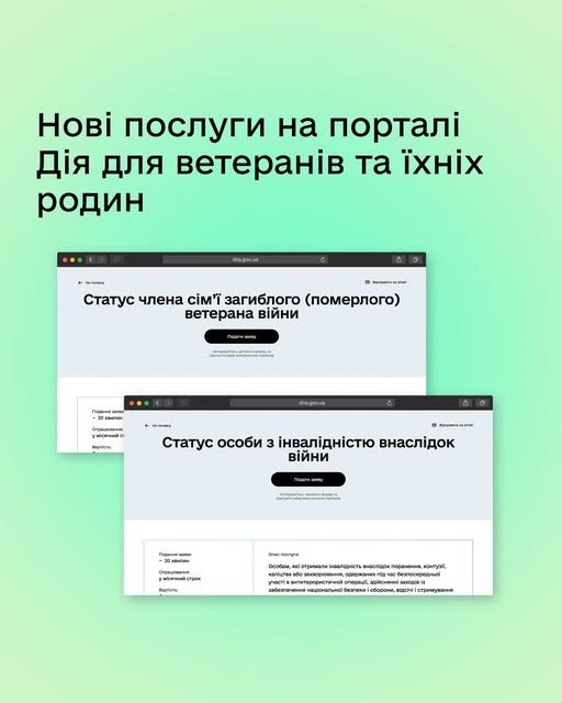 Статус особи члена сім’ї загиблого (померлого) ветерана війни https://diia.gov.ua/…/status-chlena-simi-zahybloho…