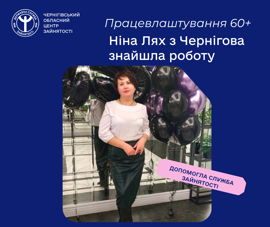 Проте, сьогодні, в умовах дефіциту кадрів, бізнес готовий брати їх на роботу. Про це свідчить приклад успішного працевлаштування 62-річної Ніни Лях з Чернігова. Жінка свого часу працювала за здобутою професією – штукатурницею, а також робітницею з комплексного обслуговування та ремонту будинків, підсобною робітницею, продавчинею. Нещодавно фахівці служби зайнятості допомогли їй знайти роботу продавцем продовольчих товарів у приватного підприємця. Роботодавець не шкодує про прийняте рішення, адже людина виявилася «на своєму місці».