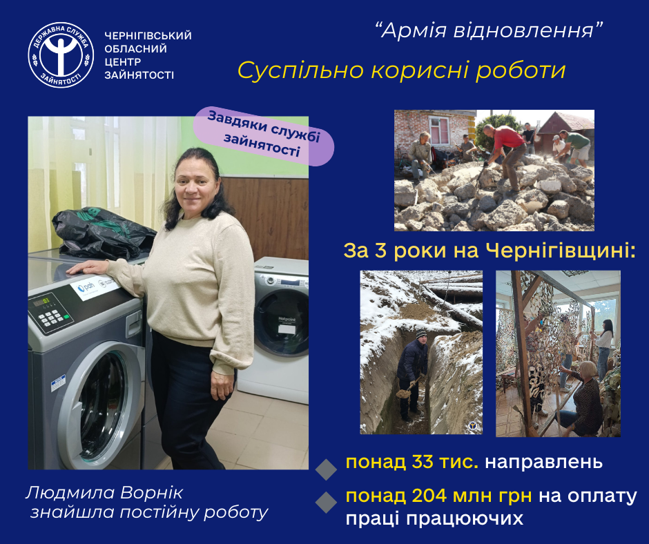 За 3 роки реалізації програми на Чернігівщині службою зайнятості видано понад 33 тис. направлень на суспільно корисні роботи. На оплату праці працюючих з Фонду загальнообов’язкового державного соціального страхування на випадок безробіття спрямовано понад 204 млн грн.